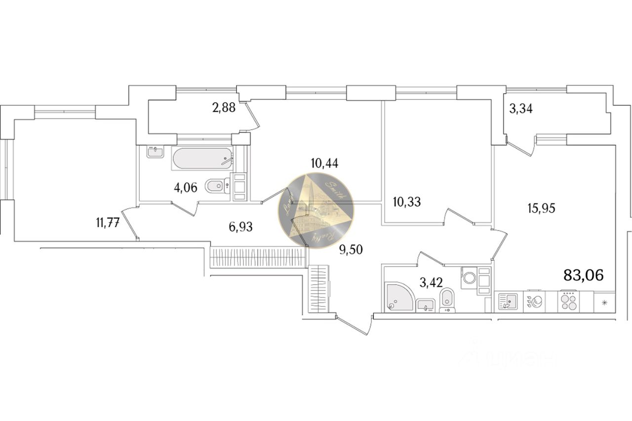 Квартира находится на 5/13 этаже. Общая площадь квартиры 83.06 м2. Светлая спальня 11.77 м2. Детские комнаты 10.44 и 10.33 м2. Просторная кухня 15.95 м2. 2 совмещённых санузла 4.06 и 3.42 м2. 2 лоджии 3.34 и 2.88 м2.