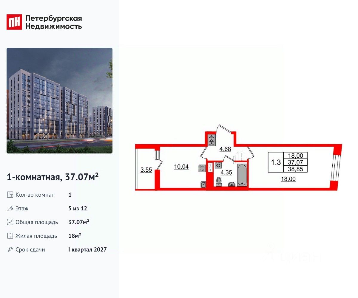 Удобная, классическая планировка, кухня 10.04 м², просторная прихожая 4.68 м². Общая площадь квартиры - 37.07 м², жилая 18 м², высота потолка 2.77 м.