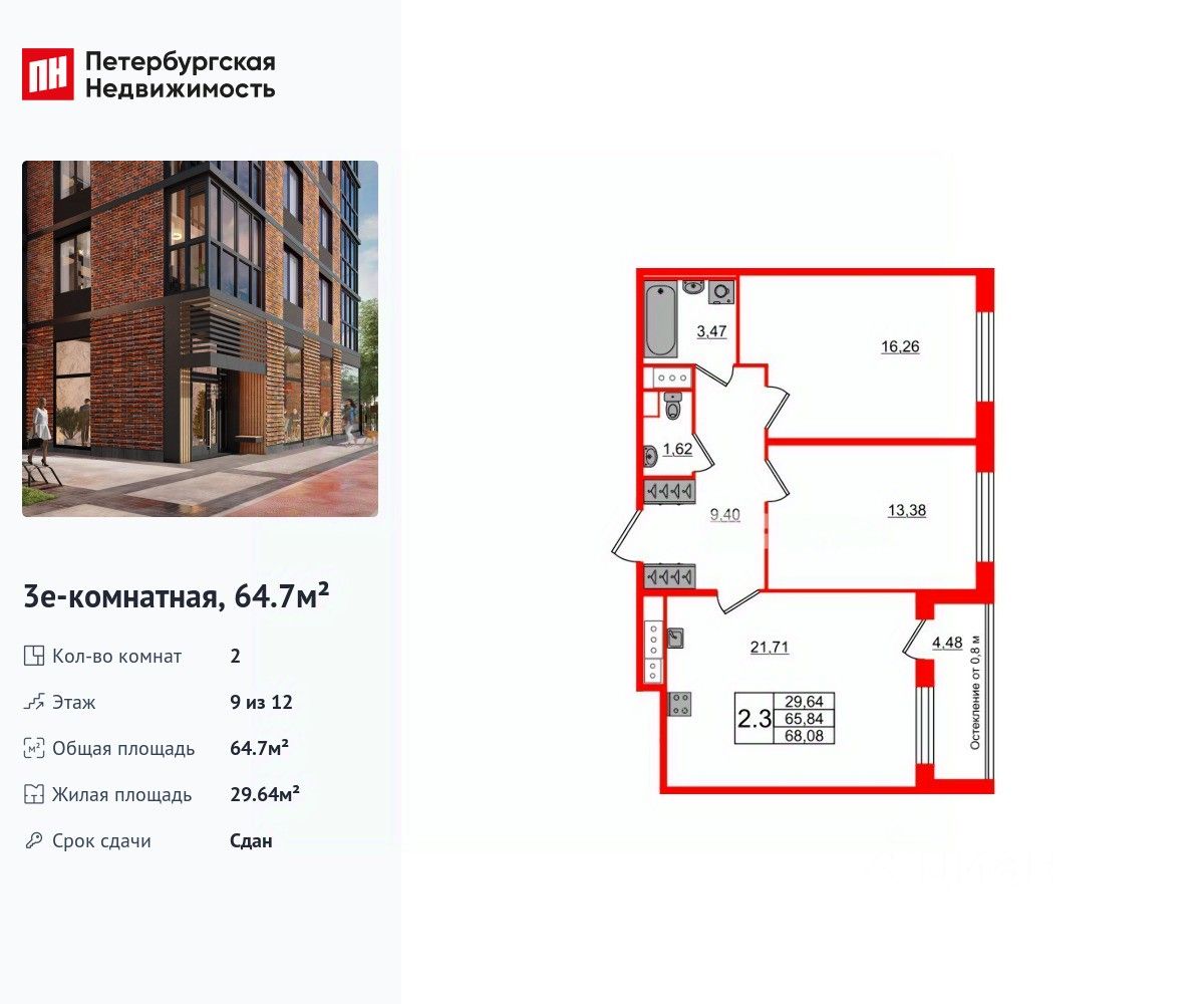 Удобная, классическая, функциональная европланировка, большая кухня-гостиная 21.71 м², просторная прихожая 9.4 м². Общая площадь квартиры - 64.7 м², жилая 29.64 м², высота потолка 2.77 м.