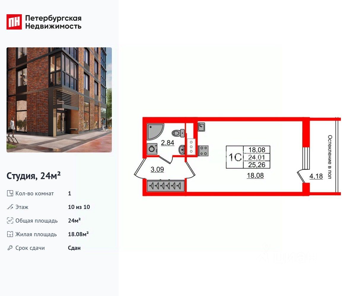Удобная, классическая, функциональная европланировка, вместительная прихожая 3.09 м². Общая площадь студии - 24 м², жилая 18.08 м², высота потолка 3 м.