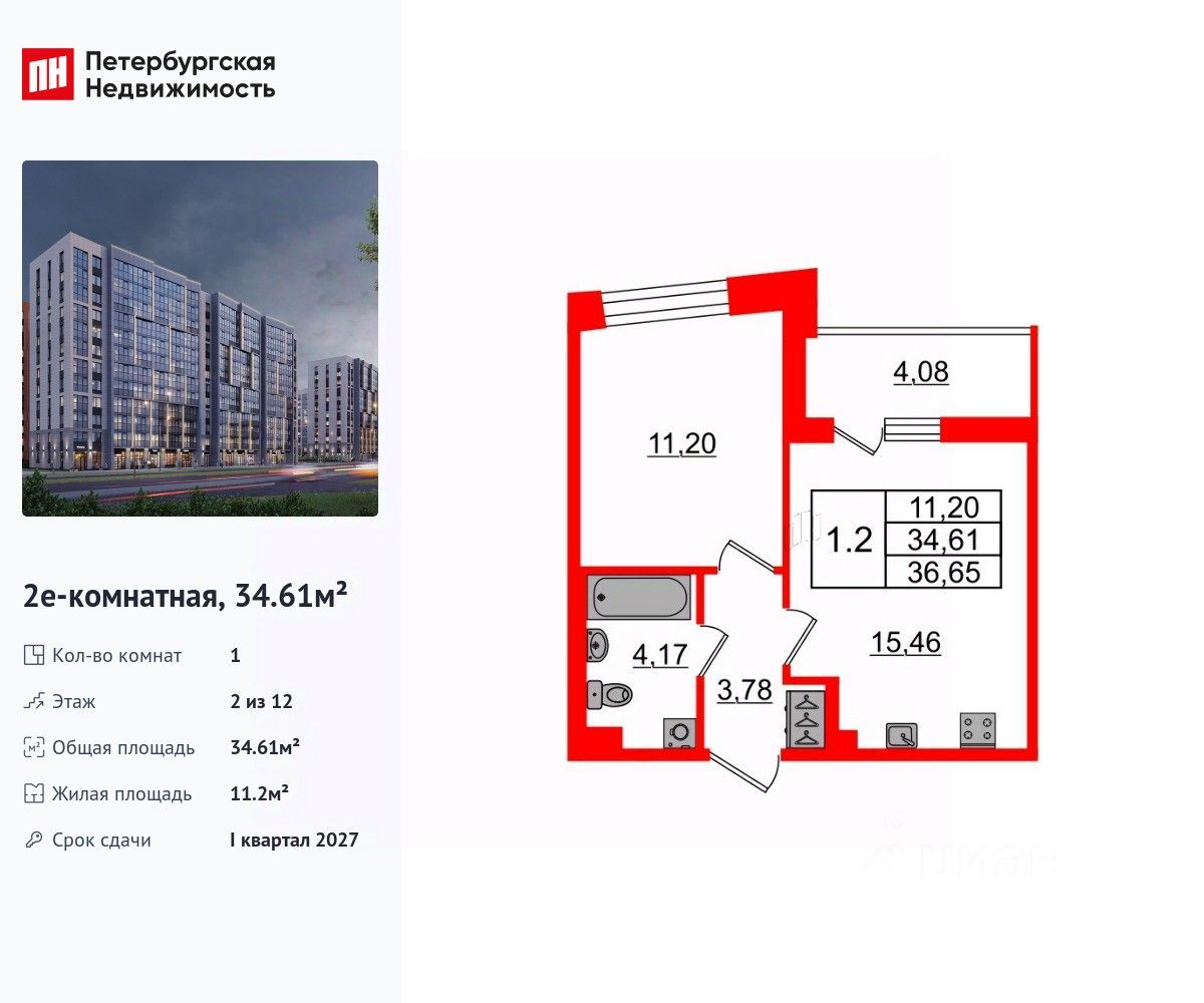 Удобная, классическая, функциональная европланировка, большая кухня-гостиная 15.46 м², вместительная прихожая 3.78 м². Общая площадь квартиры - 34.61 м², жилая 11.2 м², высота потолка 2.77 м.