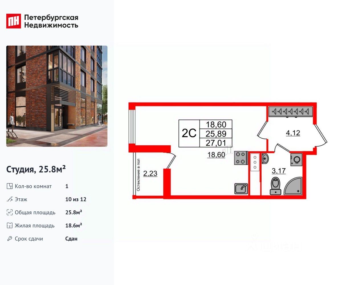 Удобная, классическая, функциональная европланировка, просторная прихожая 4.12 м². Общая площадь студии - 25.8 м², жилая 18.6 м², высота потолка 2.77 м.