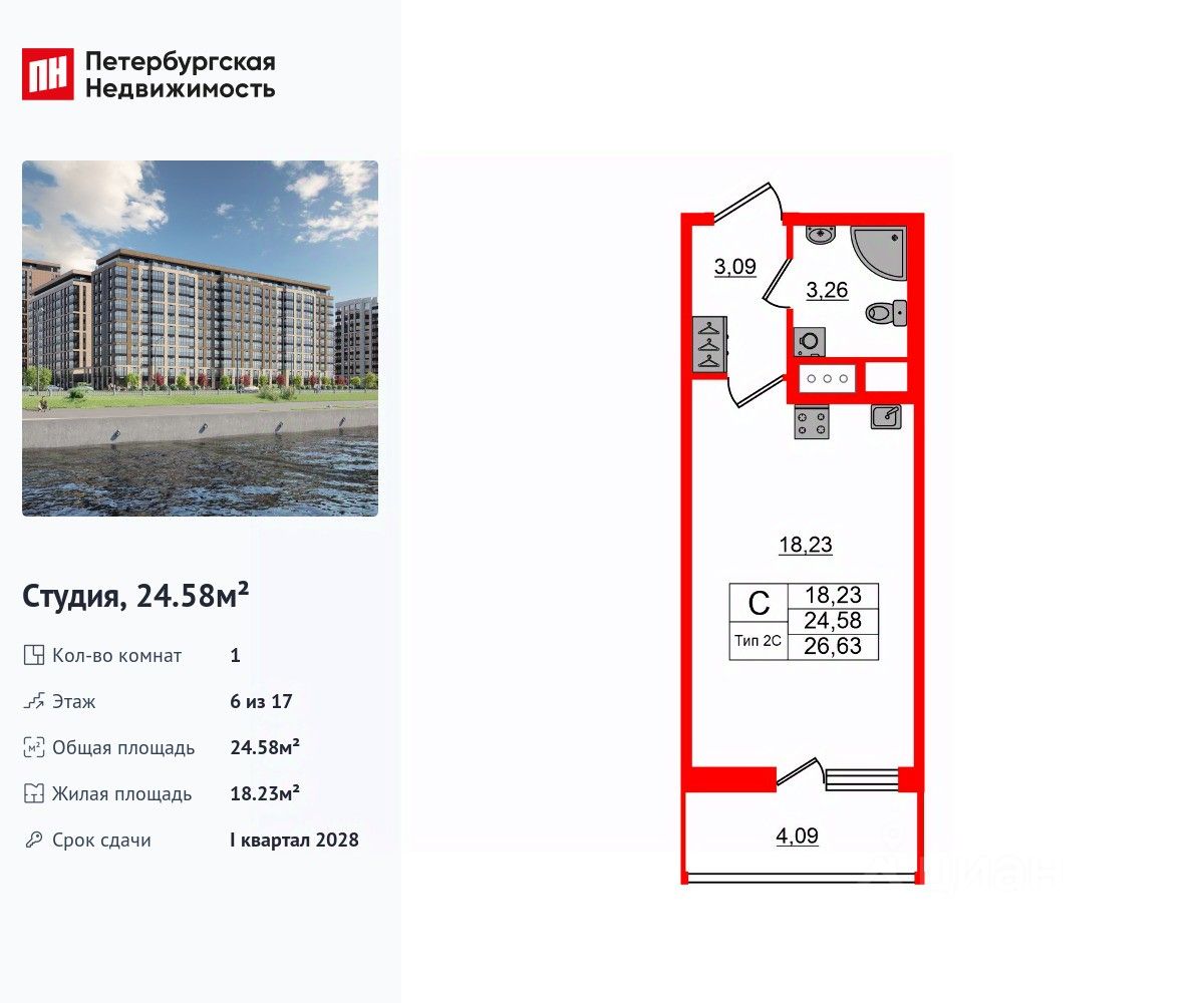Удобная, классическая, функциональная европланировка, вместительная прихожая 3.09 м². Общая площадь студии - 24.58 м², жилая 18.23 м², высота потолка 2.77 м.