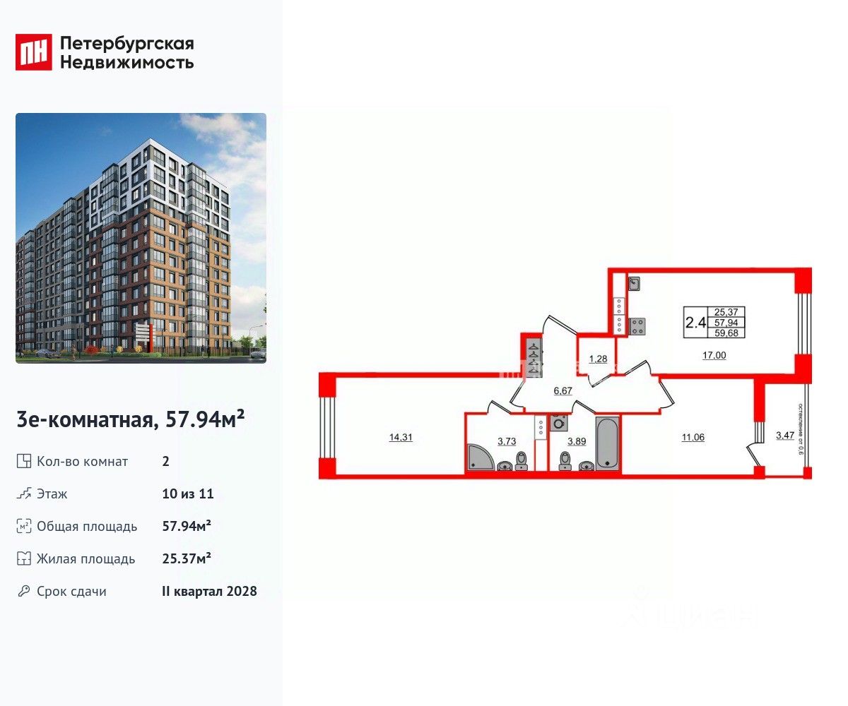 Удобная, классическая, функциональная европланировка, большая кухня-гостиная 17 м², вместительная прихожая 6.67 м². Общая площадь квартиры - 57.94 м², жилая 25.37 м², высота потолка 2.77 м.