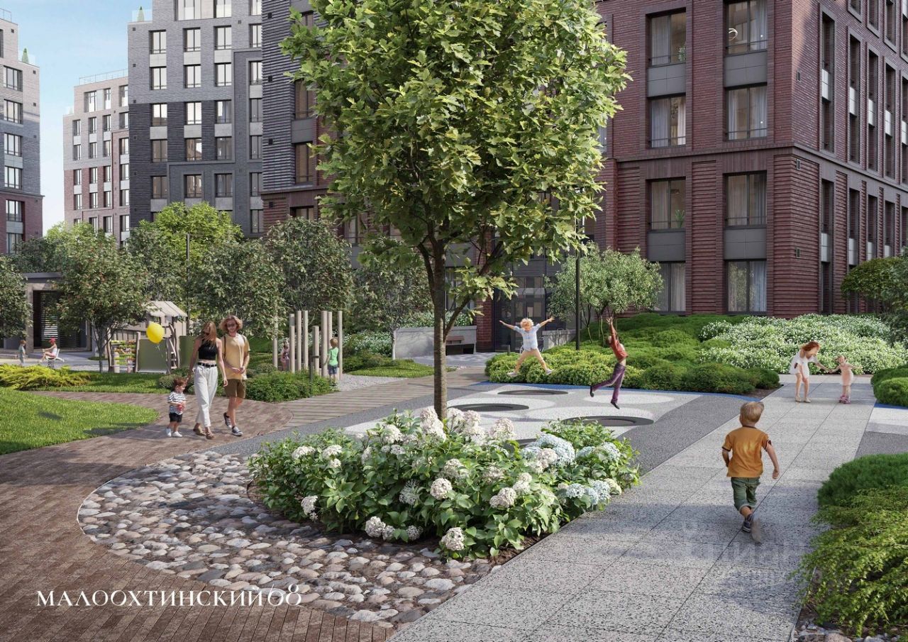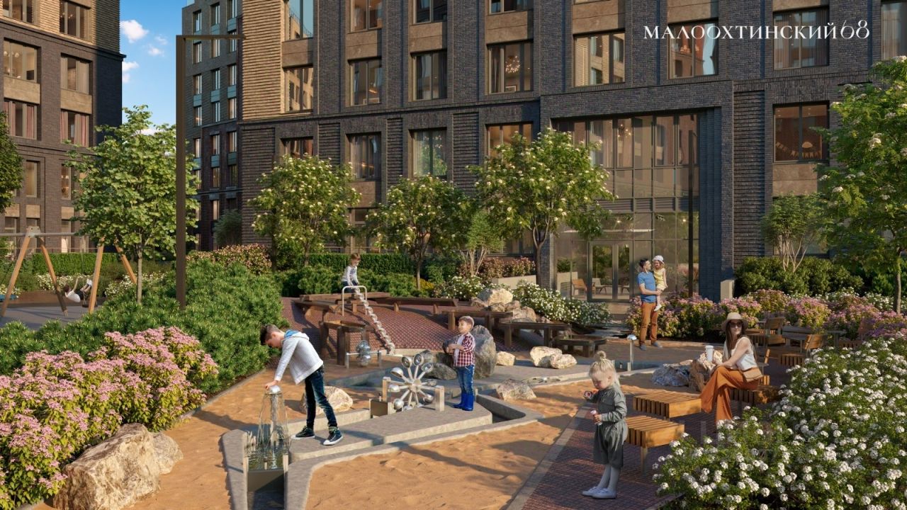 На территории ''Малоохтинского, 68'' расположены детские площадки, тренажеры для спортивных занятий и игр, зоны для спокойного отдыха. Жилые секции асимметрично расположены на территории и окружены оазисами зелени.