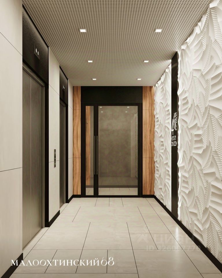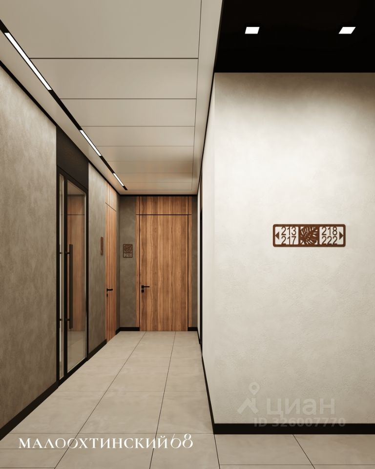 ''Малоохтинский, 68'' состоит из 16 секций: монолитные дома с остекленными фасадами. Главная входная группа выдержана в европейском стиле с использованием натуральных отделочных материалов. Просторные светлые вестибюли с панорамными окнами, помещение для почтовых ящиков, стойка консьержа, велосипедные и колясочные.