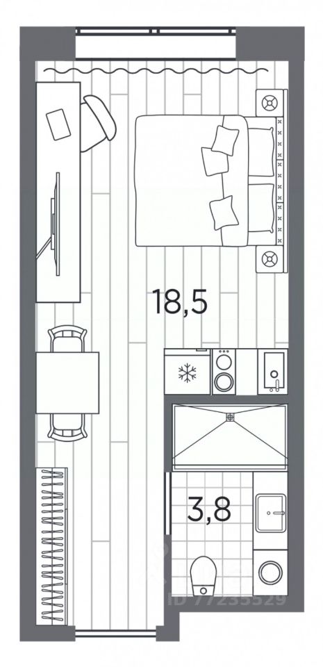 1-комн. апартаменты-студия с отделкой в ЖК ''Industrial AVENIR'' на 6 этаже. Общая площадь: 22.3 кв.м., площадь гостиной 18.5 кв.м., из которых 5 кв.м. выделено под кухонную зону. Все окна выходят на одну сторону. В апартаментах один совмещенный санузел. Высота потолков 2.5 м.
