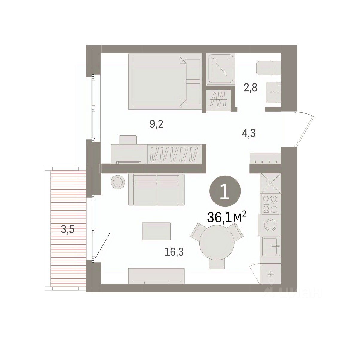 Квартира с кухней-гостиной и одной спальней в Южных кварталах. Особенности планировки: балкон, предчистовая отделка. квартиры в нашей базе: ЮКВ08-Ж3.4.9.