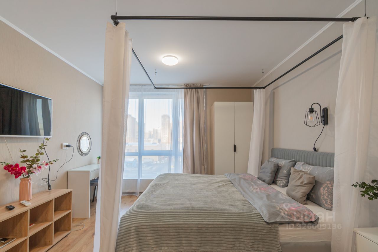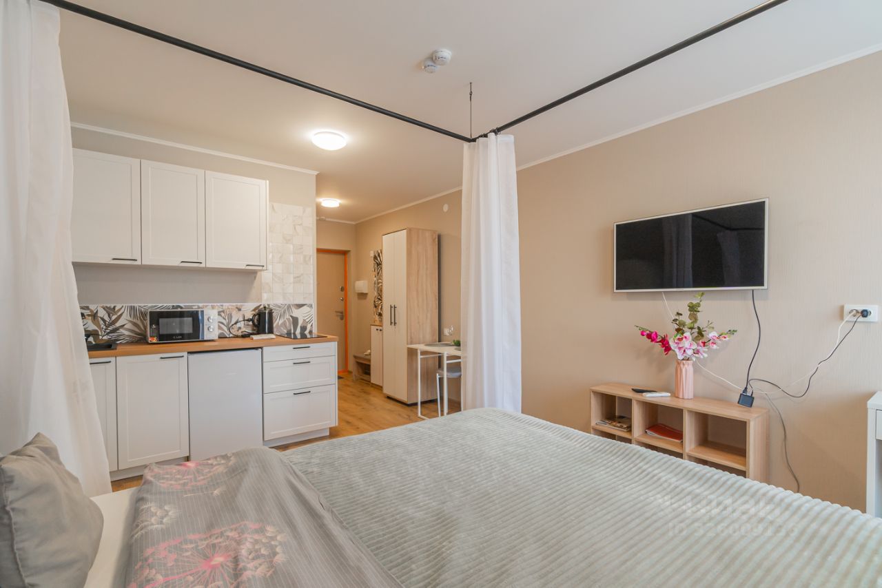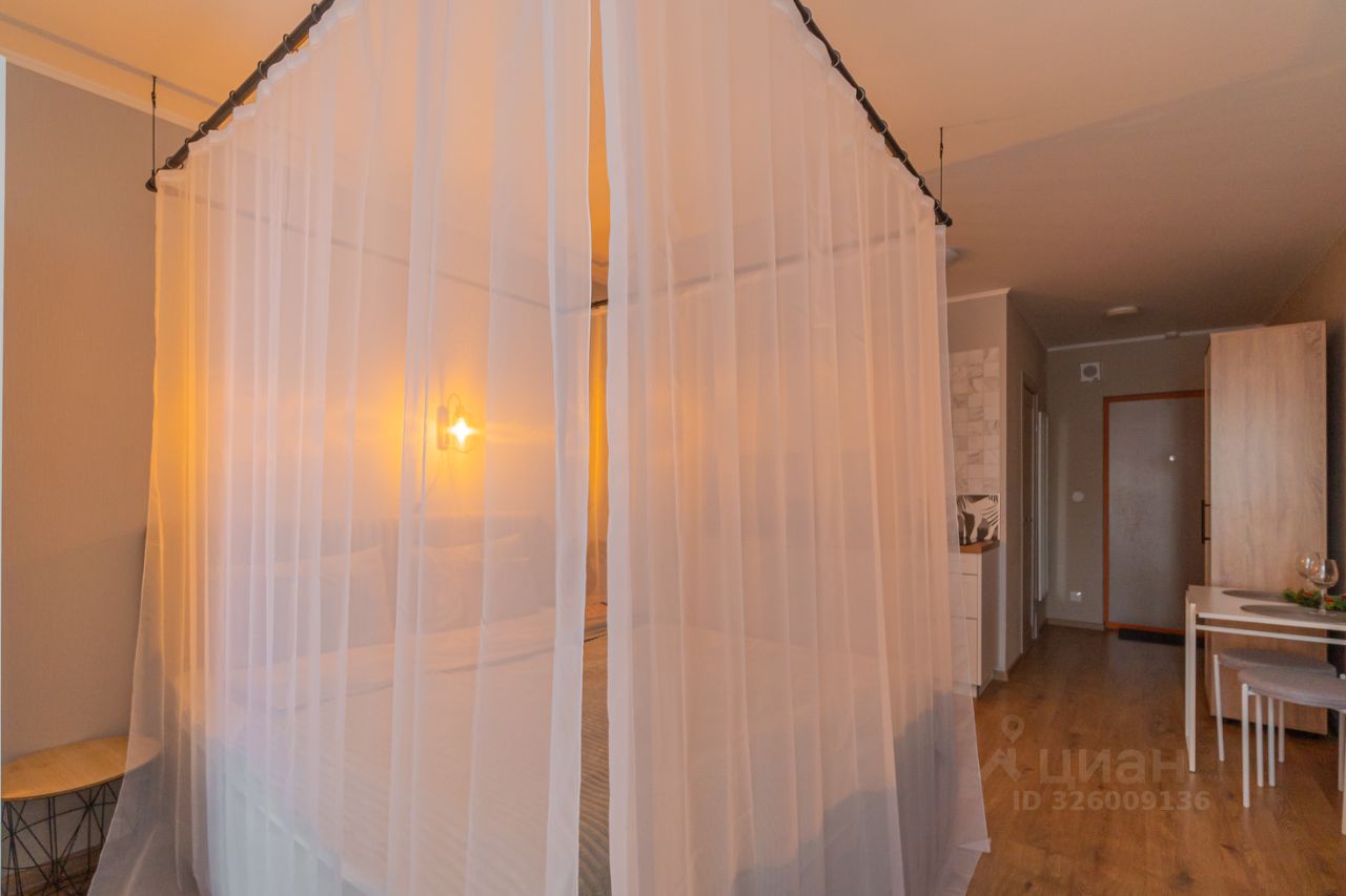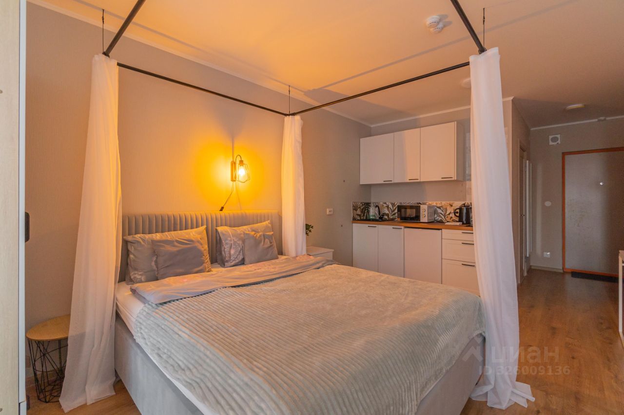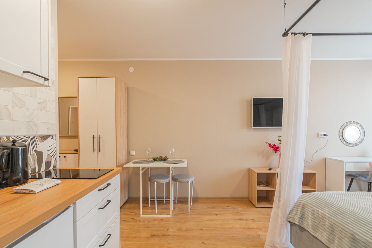 Уютные апартаменты со спальней совмещенной с кухонной и обеденной зоной с балдахином