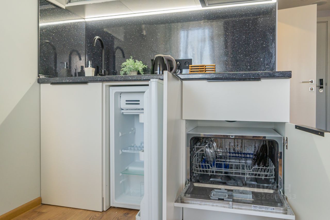 - обеденная зона (холодильник, чайник, микроволновка, плита, столовая группа, посуда на 2 персоны, стол со стульями, посудомойка)