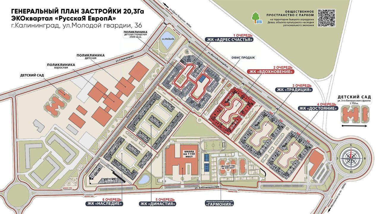 Полная социальная инфраструктура на территории комплекса: - Новая школа, - Детский сад, - Детская поликлиника.