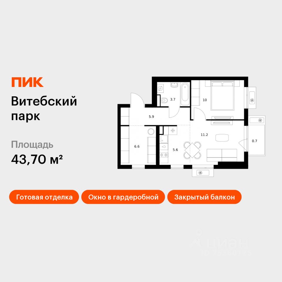 Продаётся 1-комн. квартира площадью 43,7 кв.м на 4 этаже 12 этажного дома (Корпус 6, Секция 4) проекта ПИК Витебский парк. Светлый просторный подъезд на уровне земли, функциональная планировка, большие окна, c отделкой.