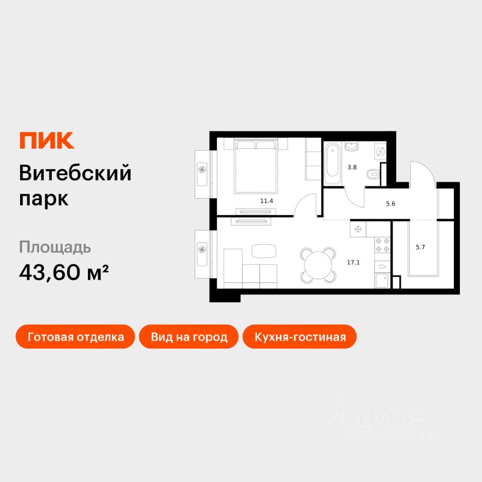 Продаётся 1-комн. квартира площадью 43,6 кв.м на 4 этаже 12 этажного дома (Корпус 6, Секция 3) проекта ПИК Витебский парк. Светлый просторный подъезд на уровне земли, функциональная планировка, большие окна, c отделкой.