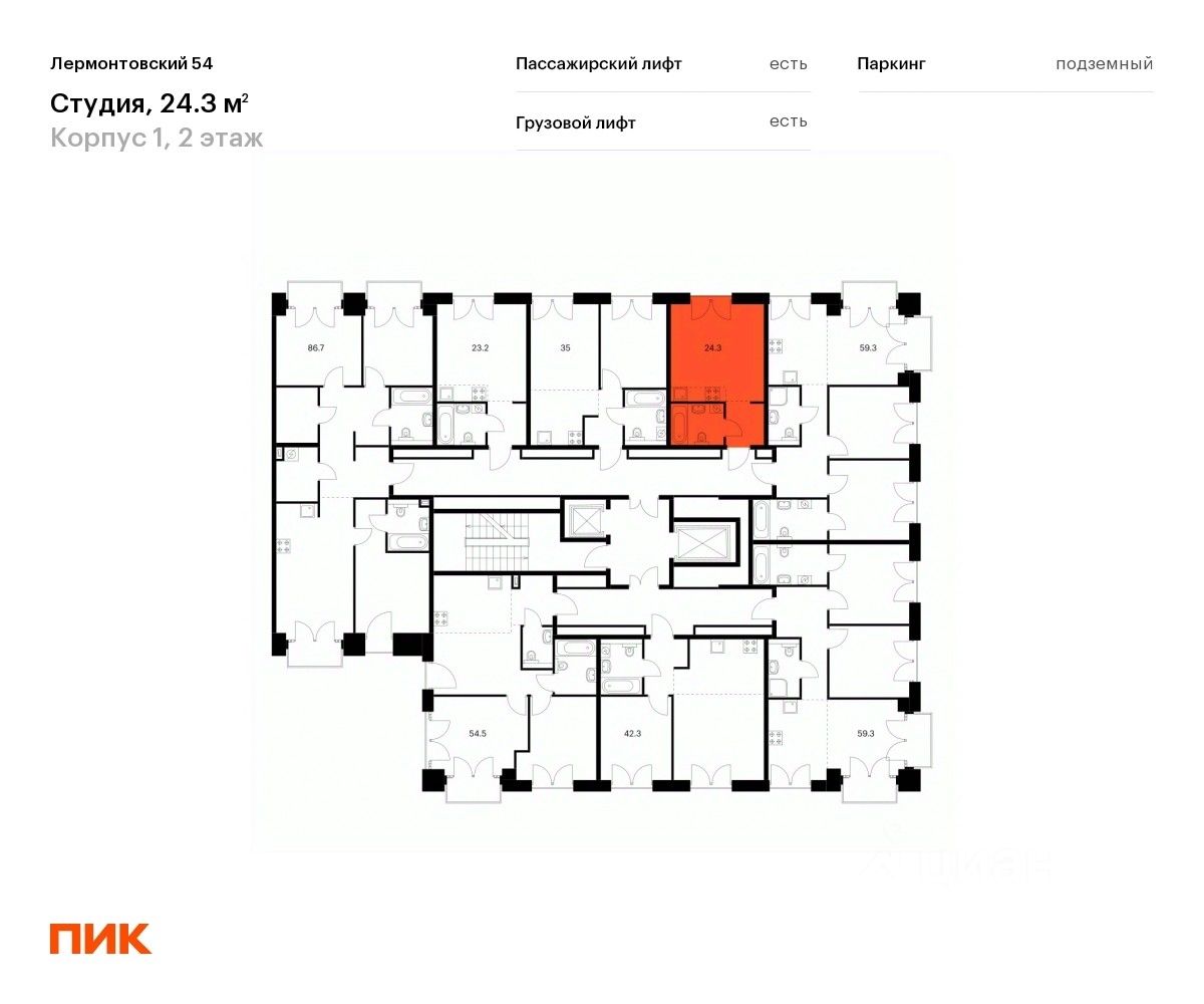 Продаётся квартира-студия площадью 24 кв.м на 2 этаже 7 этажного дома (Корпус 1, Секция 7) проекта ПИК Лермонтовский 54. Светлый просторный подъезд на уровне земли, функциональная планировка, большие окна, предчистовая отделка.