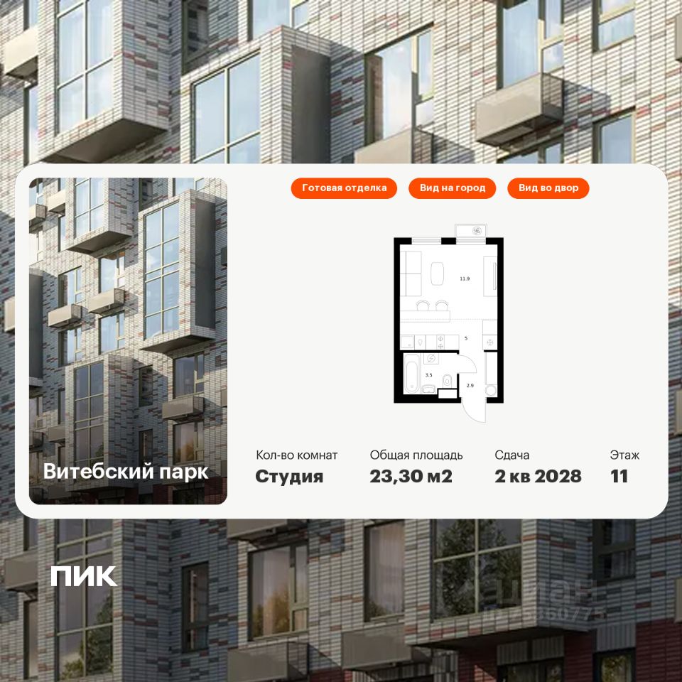 Продаётся квартира-студия площадью 23,3 кв.м на 11 этаже 12 этажного дома (Корпус 7, Секция 1) проекта ПИК Витебский парк. Светлый просторный подъезд на уровне земли, функциональная планировка, большие окна, c отделкой.