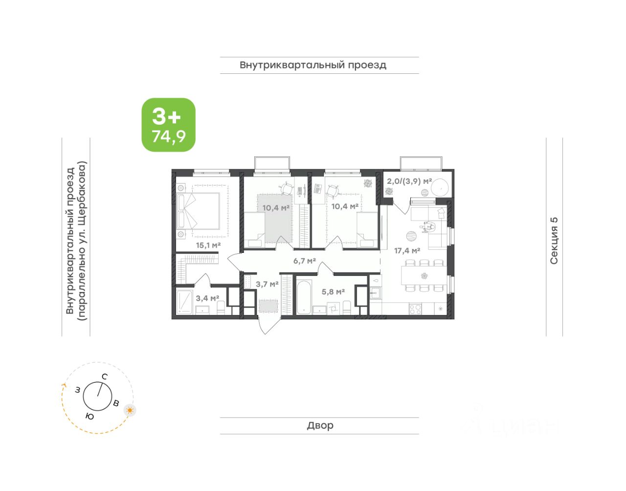 Мастер-спальня — уединённая зона комфорта. В комнате предусмотрено место под систему хранения и личный санузел с возможностью установки душевой кабины — комбинация, создающая атмосферу уюта и свободы