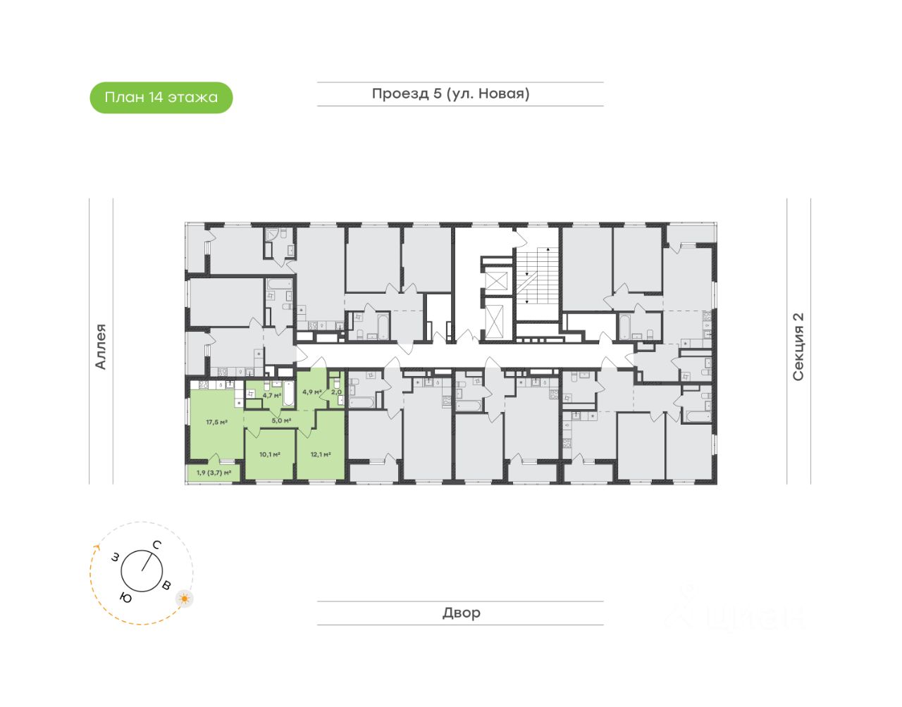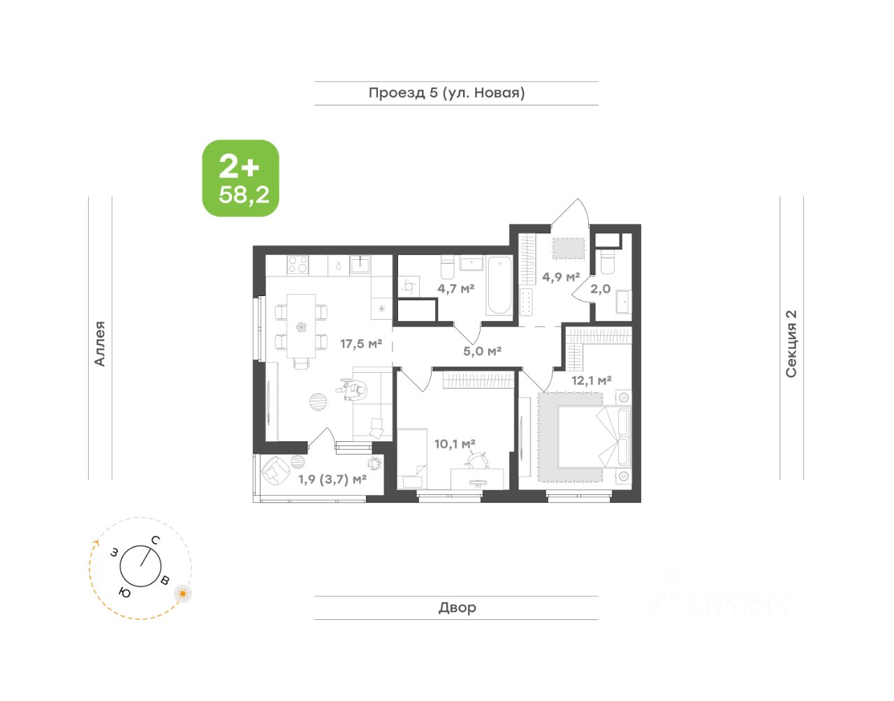 Идеальное пространство для семьи Кухня-гостиная 17,5 м²с выходом на панорамную лоджию 3,7 м²— место, где встречается вся семья. Уютное пространство для тёплых ужинов, душевных разговоров и весёлых встреч с друзьями Просторный санузел 4,7 м² с ванной — место для расслабления, а дополнительный санузел 2,0 м² гарантирует удобство для всей семьи Родительская спальня 12,1 м² станет личным уголком спокойствия. Здесь можно уединиться и расслабиться после насыщенного дня Детская комната 10,1 м² — светлая, уютная и функциональная. Достаточно места для игр, учёбы и отдыха, чтобы ребёнок чувствовал себя комфортно Прихожая 4,9 м² с выделенным местом под систему хранения поможет поддерживать порядок и избавит от необходимости искать место для верхней одежды и обуви Коридор 5,0 м² отвечает за удобную навигацию по квартире, связывая все зоны в единое, гармоничное целое Окна на две стороны наполняют квартиру светом в любое время суток, формируя гармонию и вдохновение, которые так легко ощутить