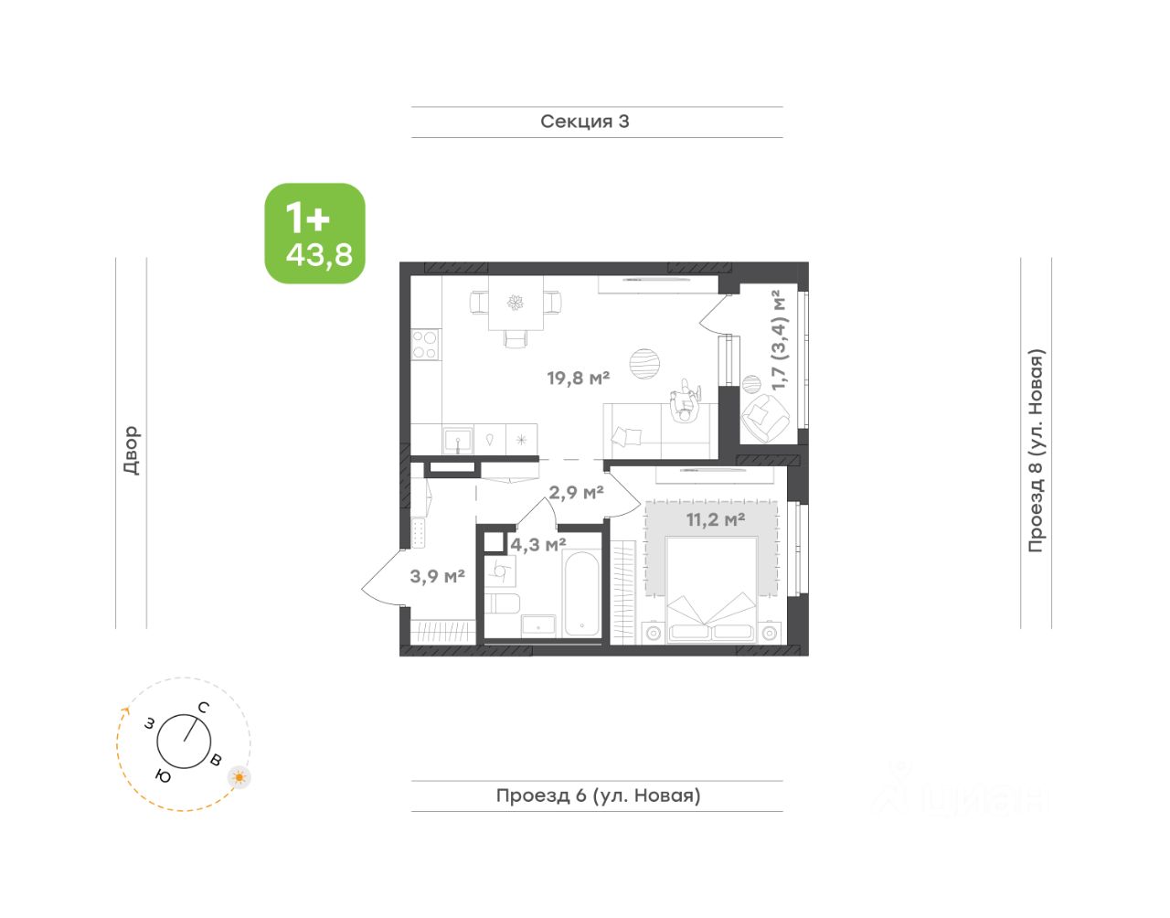 Квартира, которая легко адаптируется под ваш ритм жизни Кухня-гостиная 19,8 м² с выходом на лоджию — сердце квартиры, наполненное светом и уютом. Здесь удобно готовить, принимать гостей или отдыхать после долгого дня С лоджии 3,4 м² открывается живописный вид на город, позволяя наслаждаться им в любое время дня Спальня 11,2 м² — место для отдыха и восстановления. Пространство продумано так, чтобы здесь было комфортно и уютно, а выделенная зона под шкаф поможет организовать хранение без перегруженности интерьера Санузел 4,3 м² — стильный и функциональный. Достаточно места для всей необходимой сантехники, а грамотная планировка делает пространство удобным Прихожая 3,9 м² встречает продуманным местом для хранения.