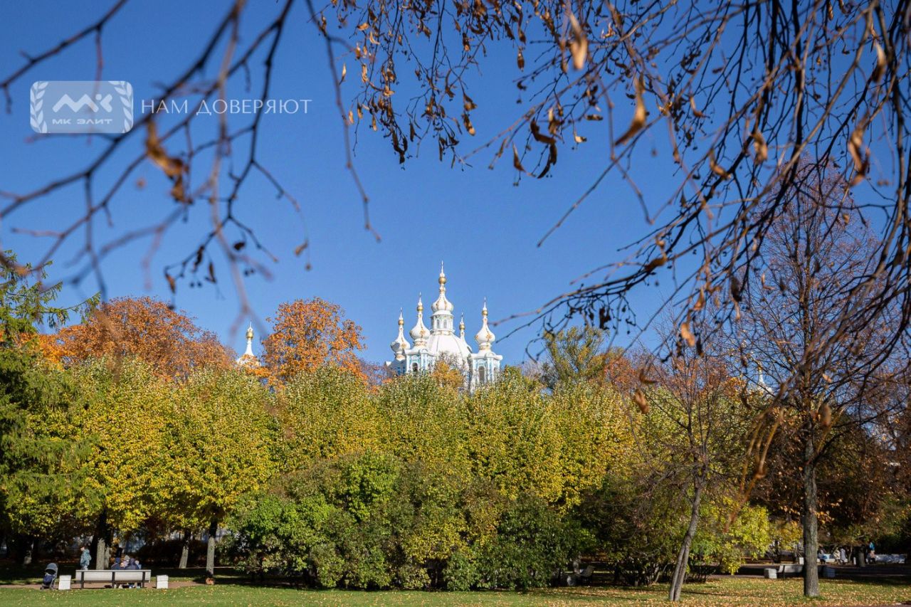 Уникальный вид из окон квартиры выходит на величественный ансамбль Смольного Собора, творение архитектора Растрелли Ф.Б., на красивейщий парк, с грациозными фонтанами, вековыми деревьями, пышными цветниками, цветущей в мае сакурой, множеством нежно-розовых лепестков, никого не оставит равнодушным.