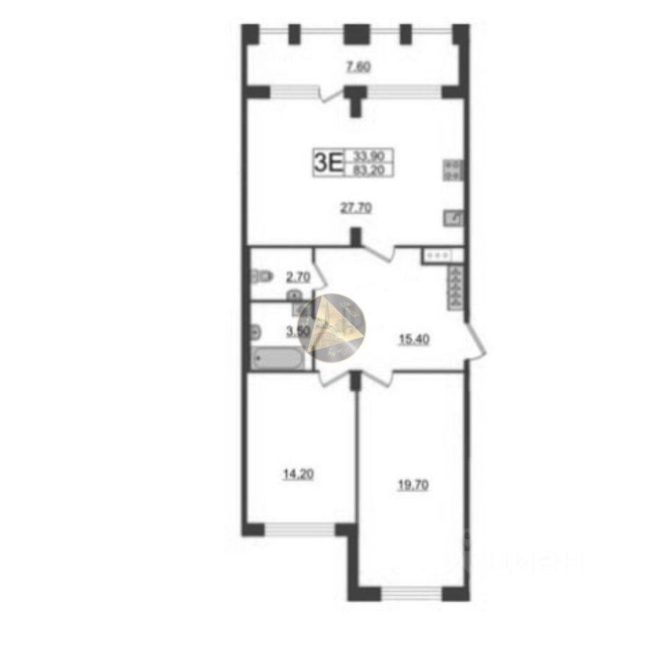 О квартире: - Квартира находится на 3 этаже 10-этажного дома - Общая площадь квартиры 83.20 м2 - Уединённая спальня 14.20 м2 - Детская комната 19.70 м2 - Просторная кухня-гостиная 27.70 м2 - Раздельный санузел 3.50 + 2.70 м2 - Застеклённая лоджия 7.60 м2