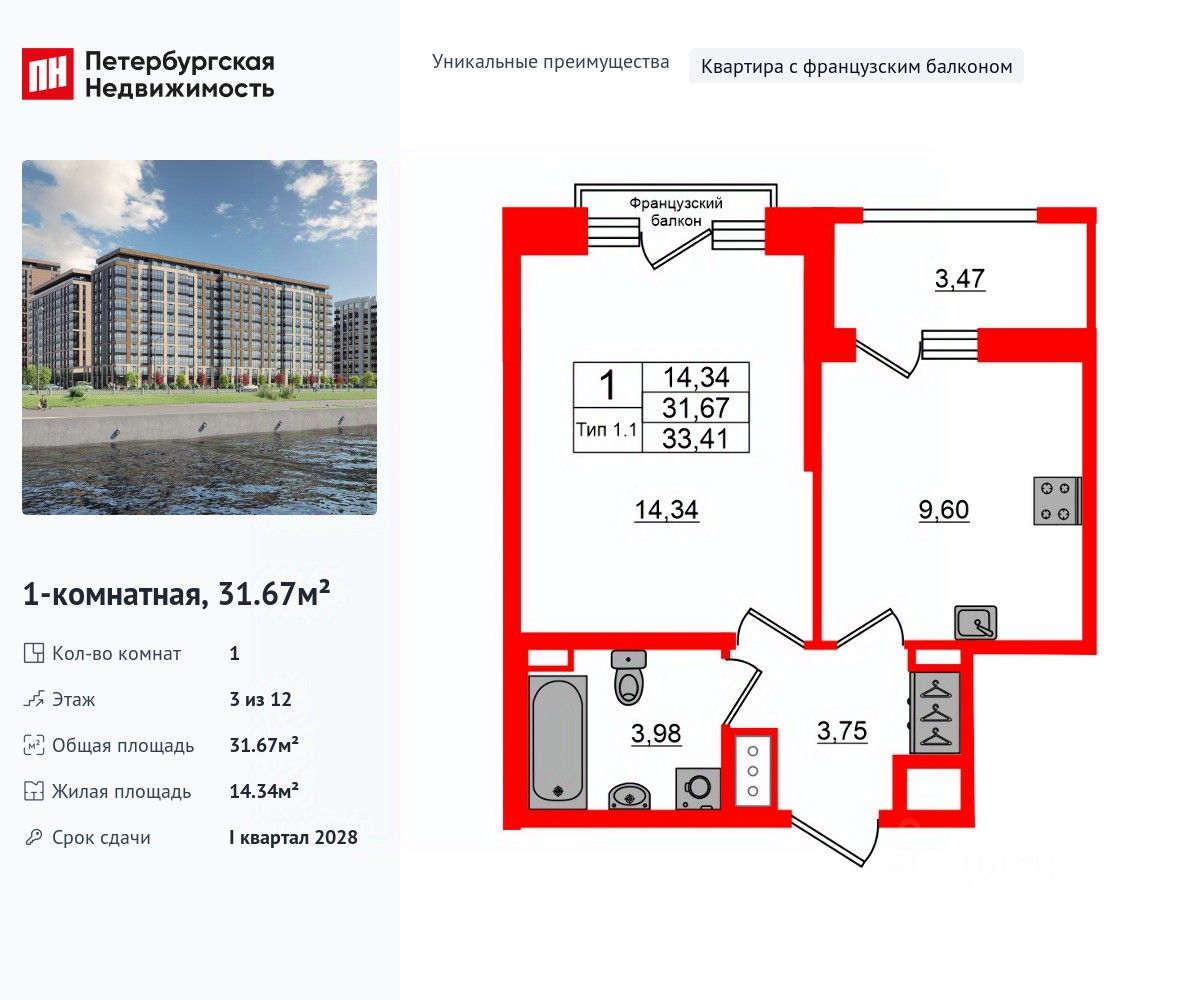 Уникальная планировка, кухня 9.6 м², вместительная прихожая 3.75 м². Общая площадь квартиры - 31.67 м², жилая 14.34 м², высота потолка 2.77 м.