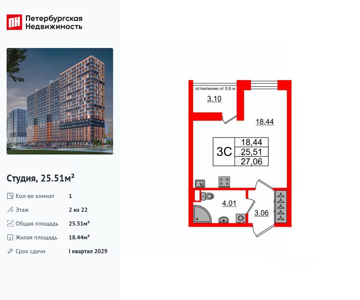 Удобная, классическая, функциональная европланировка, вместительная прихожая 3.06 м². Общая площадь студии - 25.51 м², жилая 18.44 м², высота потолка 2.77 м.