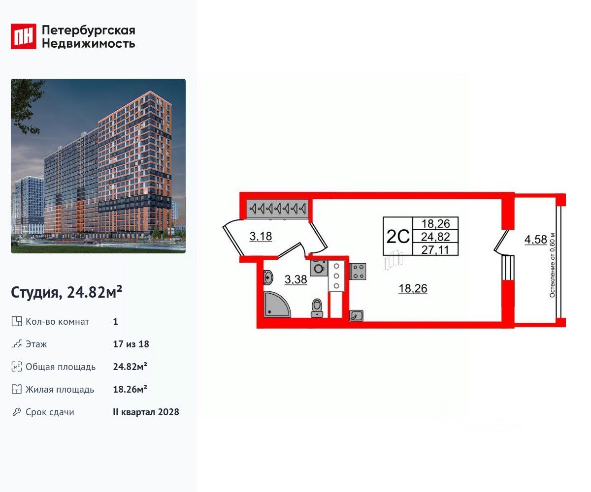Удобная, классическая, функциональная европланировка, вместительная прихожая 3.18 м². Общая площадь студии - 24.82 м², жилая 18.26 м², высота потолка 2.77 м.