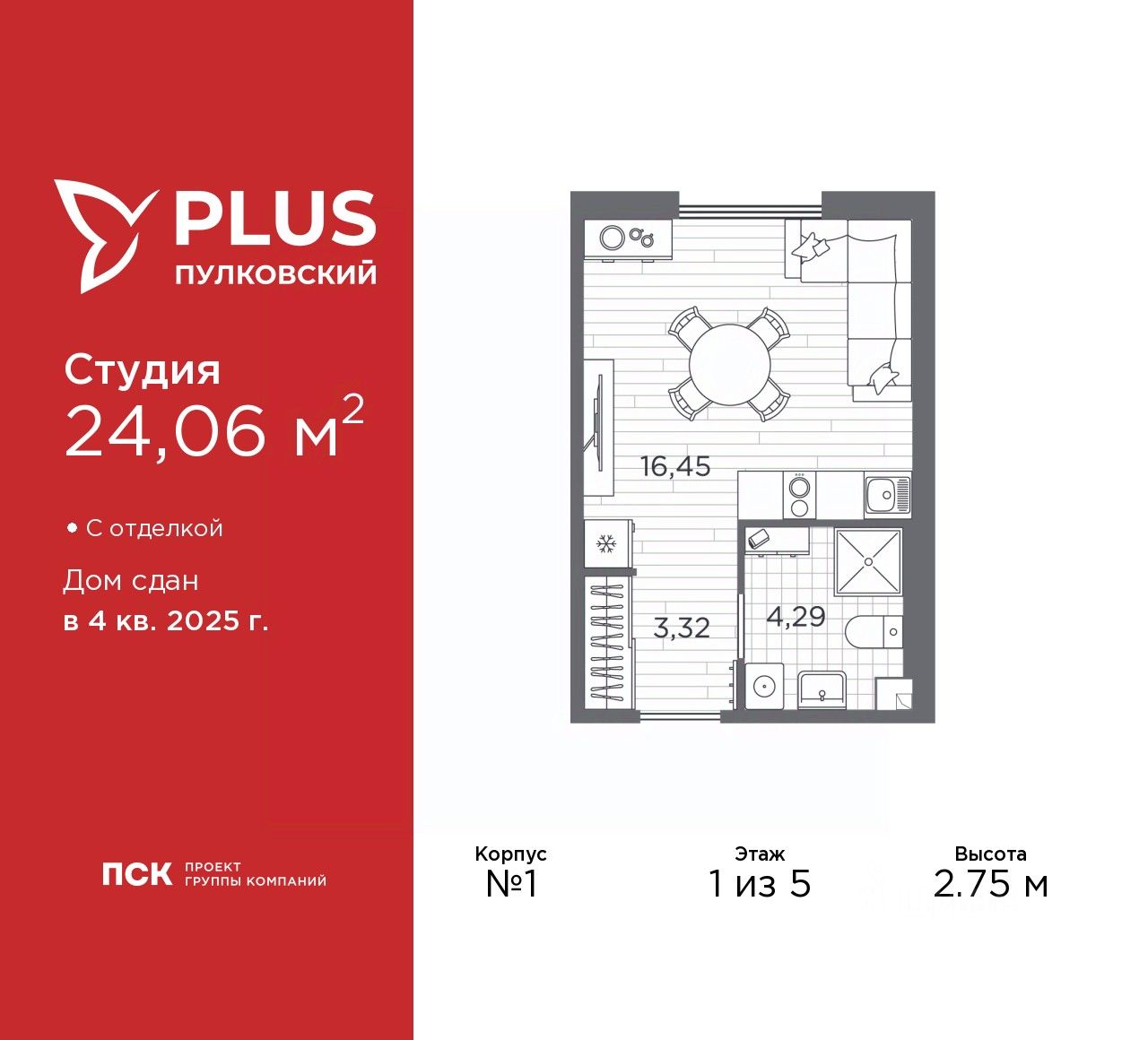 1-комн. квартира-студия от застройщика с отделкой в ЖК ''PLUS Пулковский'' на 1 этаже. Общая площадь: 24.06 кв.м. Высота потолков 2.75 м.