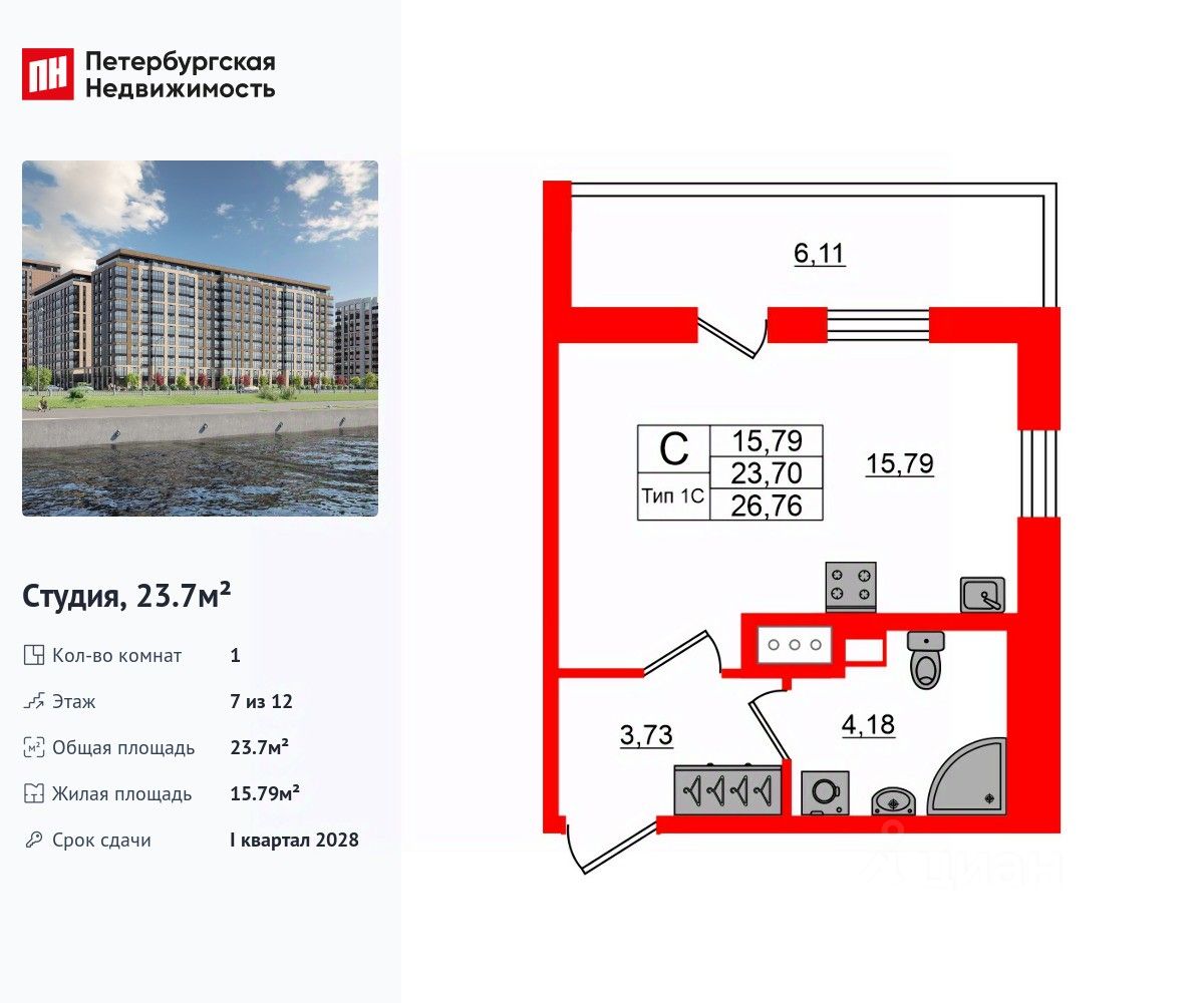 Удобная, классическая, функциональная европланировка, просторная прихожая 3.73 м². Общая площадь студии - 23.7 м², жилая 15.79 м², высота потолка 2.77 м.