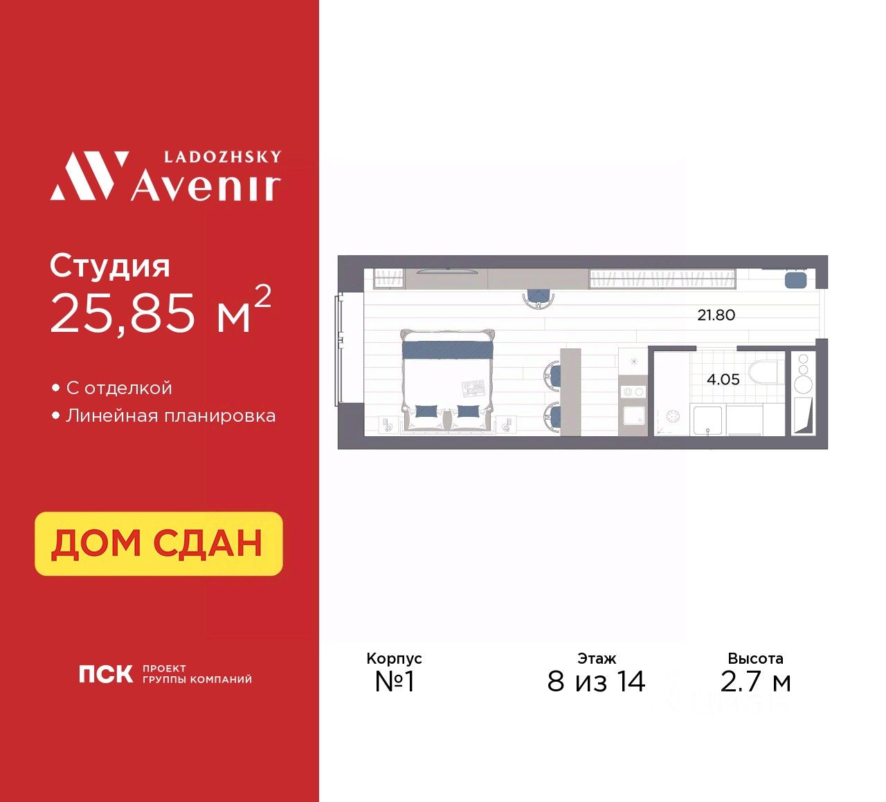 Просторные однокомнатные апартаменты-студия с отделкой в ЖК ''Ladozhsky AVENIR'' на 8 этаже. Общая площадь: 25.85 кв.м., площадь гостиной 21.8 кв.м., из которых 5 кв.м. выделено под кухонную зону. Все окна выходят на одну сторону. В апартаментах один совмещенный санузел. Высота потолков 2.7 м.