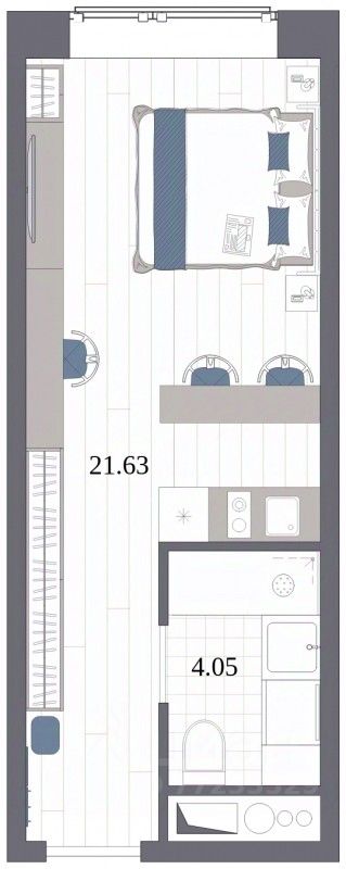 Просторные однокомнатные апартаменты-студия с отделкой в ЖК ''Ladozhsky AVENIR'' на 8 этаже. Общая площадь: 25.68 кв.м., площадь гостиной 21.63 кв.м., из которых 5 кв.м. выделено под кухонную зону. Все окна выходят на одну сторону. В апартаментах один совмещенный санузел. Высота потолков 2.7 м.