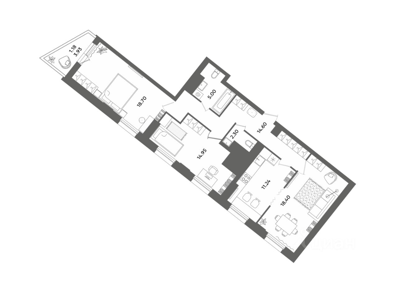 Уютная кухня-столовая 11.2 кв.м. имеет выход в соседнюю комнату 18.4 кв.м. в которой удобно расположить гостиную с зоной для отдыха и приёма гостей. При желании кухню можно отделить от комнаты убрав проём в стене. Спальные комнаты: одна комната 18.7 кв.м. с выходом на балкон 3.9 кв.м и окном, вторая комната 14.9 кв.м. порадует большой освещённостью за счёт двух окон. Прихожая 14.6 кв.м. позволит разместить большой шкаф. Два санузела. Этаж 22.