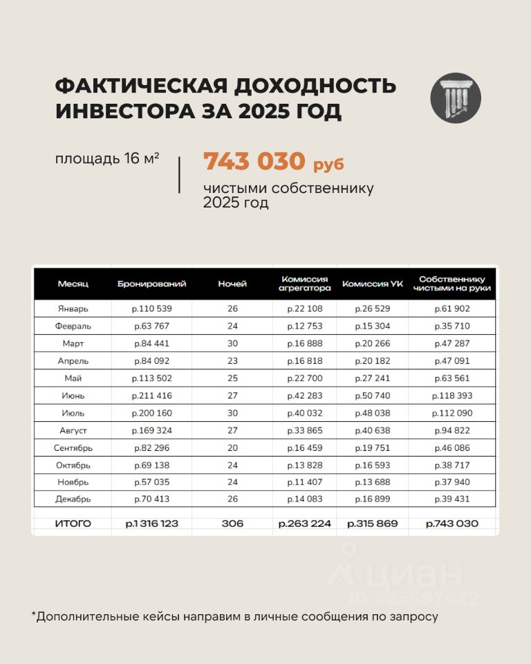 - Средняя фактическая доходность 1 026 000 р - 1 510 000 р (закрытая аналитика компании за 2025 год) без учета капитализации актива