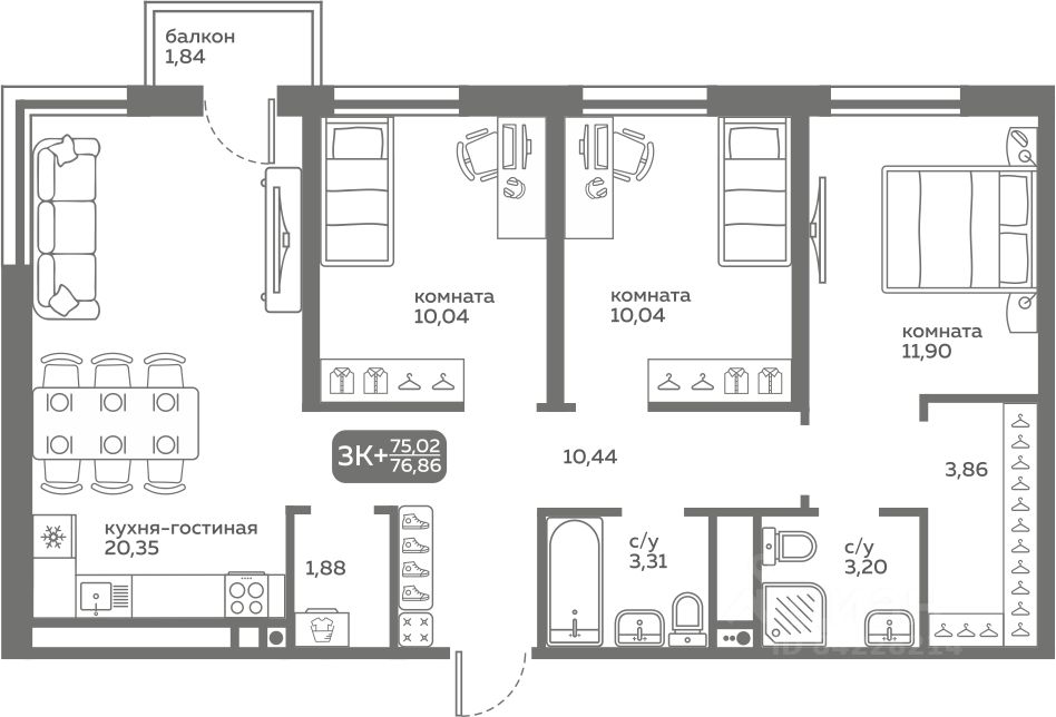 Прямая продажа от застройщика! Продается трёхкомнатная квартира в строящемся ЖК ''Меридиан Слобода'', срок сдачи: I-кв. 2027, общей площадью 75.02 м², на 6 этаже из 20. Площадь кухни — 20.35 м².