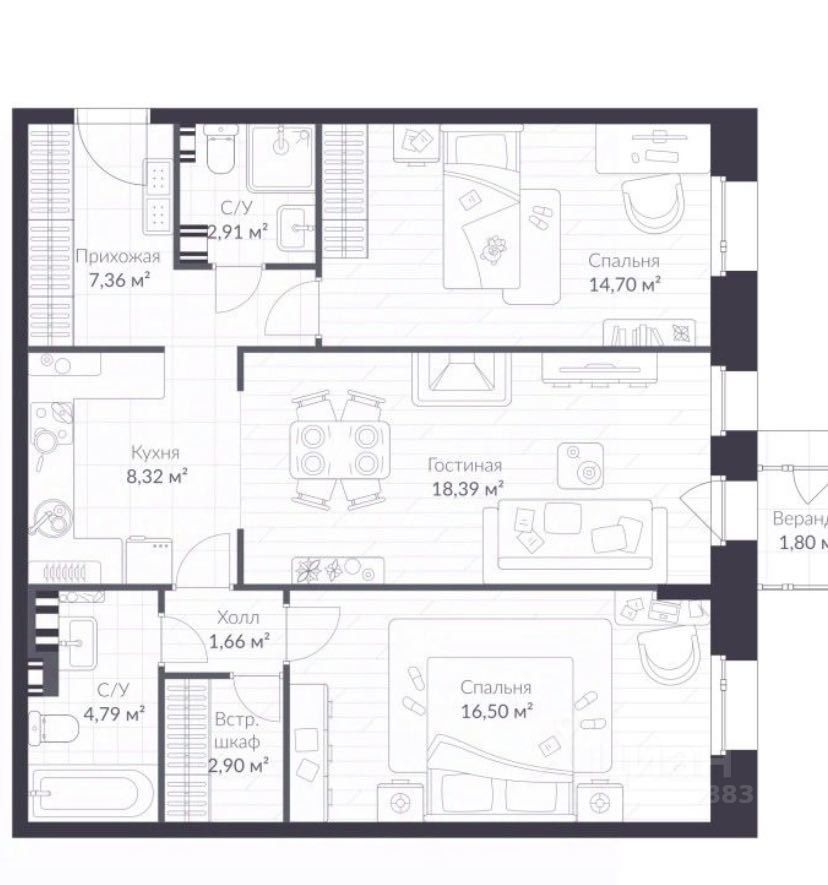 Стрельна'' на 2 этаже. Квартира без отделки, полностью готова к ремонту. Общая площадь: 78,3 кв.м., Комнаты изолированные, все окна выходят на одну сторону. В квартире небольшая веранда, два совмещенных санузла. Высота потолков 2.8 м.