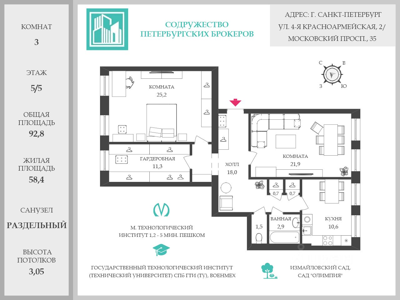 Петербург, место, которое не нуждается в комментариях. 4-я Красноармейская, 2 / Московский, 35. Доходный дом 1881 года, эклектика в лучшем её проявлении. Эпоха, когда дома строили на века. ________________________________________ Дом с биографией. Архитекторы — Эммануил Юргенс и Иоганн Иорс. Кирпичный, пятиэтажный. Перекрытия — ж/б, проведён капитальный ремонт. Фундамент — ленточный. Центральные коммуникации. Закрытый двор. Парковка во дворе — место закреплено. Дом обслуживается управляющей компанией ЖКС 1 Адмиралтейского района. Крыша и системы ГВС обновлены — проведён плановый ремонт. ________________________________________ Квартира 92,8 м². Пятый этаж — без лифта, зато с чистой, ухоженной лестницей и с ощущением приватности. Потолки 3,17 м — воздух, свет и ощущение пространства. Две изолированные комнаты и редкая роскошь — гардеробная с окном. Квартира двусторонняя: окна выходят и во двор, и на улицу — в правильном балансе. Над квартирой — чердак. Разводка труб сверху, стабильный напор воды — мелочи, которые ценят опытные покупатели. Зимой в квартире тепло. Летом не жарко. Шумоизоляция — та самая, которую больше не строят. ________________________________________ Интерьер без показной театральности Капитальный ремонт дома — 1970 год. Дизайнерский ремонт квартиры — 2015. Мебель и техника от ведущих производителей. Изысканно, интеллигентно, без вычурности . Санузел раздельный. Встроенная кухня сделана со вкусом. ________________________________________ Локация, где всё уже есть Метро Технологический институт I и II — 4 минуты пешком. До Пушкинской 15 минут. Вокруг — университеты, школы, детские сады, клиники, магазины. Напротив парк для неспешных прогулок Адмиралтейский район — городская инфраструктура, сложившаяся давно. ________________________________________ Сделка Продажа по договору купли-продажи. Полная рыночная стоимость. Ипотека возможна. Собственность. Обременений нет. Документы готовы. ________________________________________ Это квартира для тех, кто ценит тишину в центре. Звоните. Записывайтесь на просмотр.
