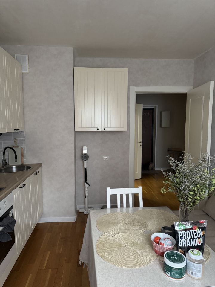 В квартире выполнен евроремонт, что создаёт уютную и современную атмосферу. Жилая комната и кухня обставлены необходимой мебелью, что позволит вам сразу же комфортно разместиться. На кухне установлена современная техника: холодильник, посудомоечная и стиральная машины.