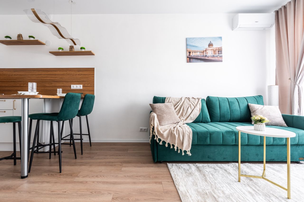 Для вашего комфорта предусмотрены: - Кондиционер, поддерживающий идеальный климат. - Водонагреватель (бойлер) - всегда есть горячая вода. - Посудомоечная и стиральная машины избавляет вас от повседневных забот. - Компактный холодильник. - Просторная двуспальная кровать 160см. - Удобный изумрудный раскладной диван шириной 160см. - Всё необходимое для комфортного быта: Варочная панель, Чайник, Фен, Утюг и гладильная доска, Телевизор, фильтр для воды. - Бесплатный высокоскоростной Wi-Fi. - Smаrt-tv. - Посуда, удобная сушилка для белья.