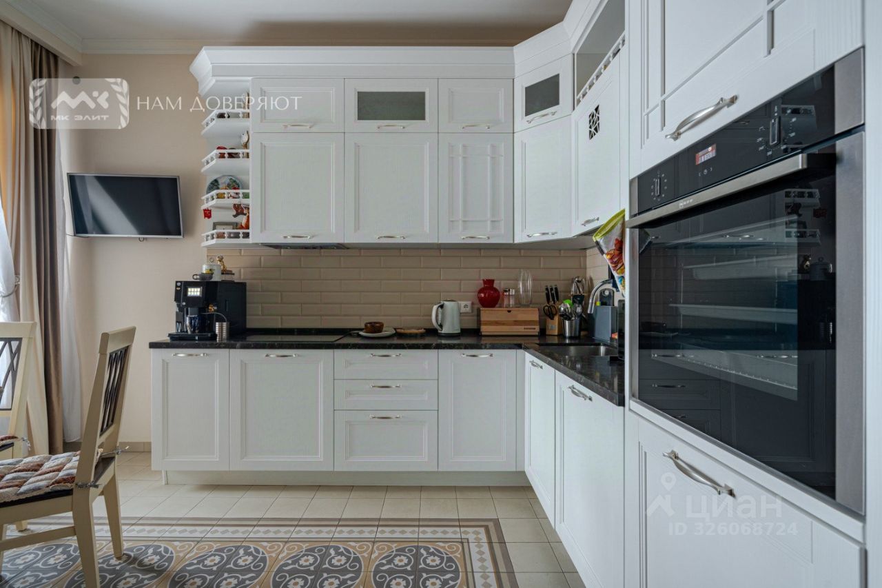 Кухня полностью укомплектована техникой, посудой и кухонной утварью для приготовления пищи: варочная панель, духовой шкаф Neff, холодильник, стиральная машина Electrolux c сушкой, посудомоечная машина Bosh, чайник, микроволновая печь, кофемашина, сэндвич-тостер Tefal.