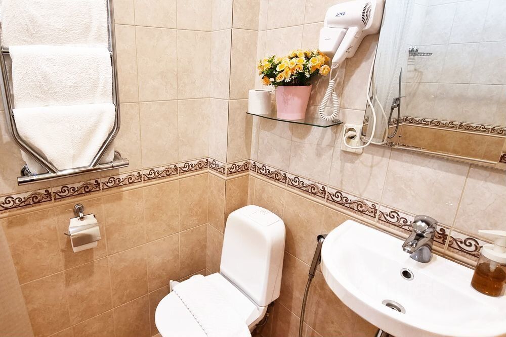 Санузел персональный и находится в самой студии (Только Ваш), оборудован душевой кабиной, туалетом, умывальником, феном, есть тёплый пол, мы выдаём полотенца и свежее бельё.