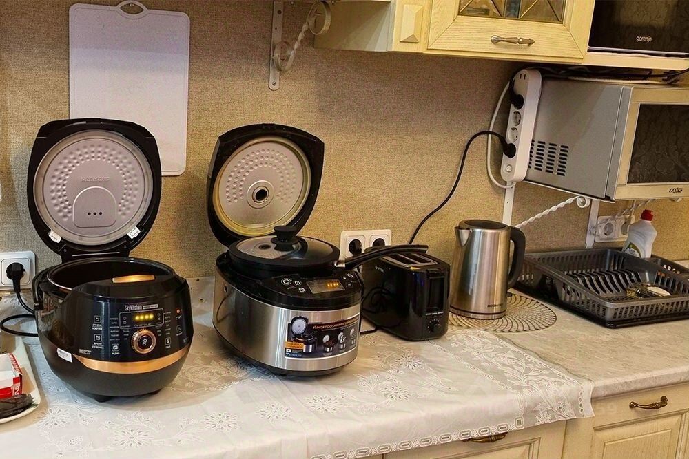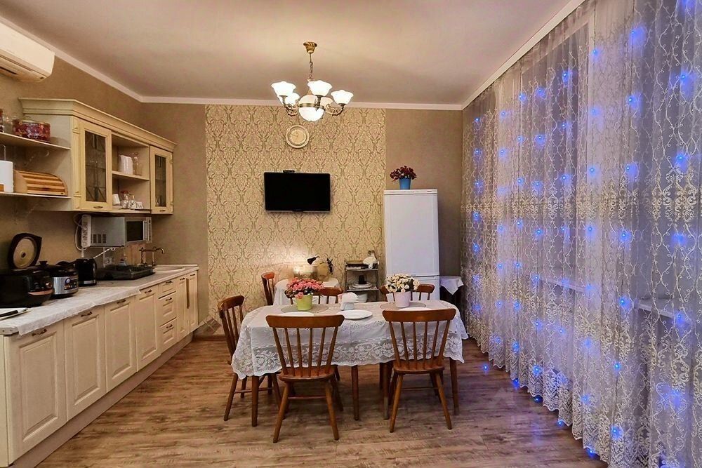 На просторной кухне, в любое время тихо и чисто, к Вашим услугам: кулер с питьевой водой, холодильник, микроволновая печь, мультиварка, гриль, чайник, тостер, утюг с гладильной доской, стиральная машина, посуда и столовые приборы.