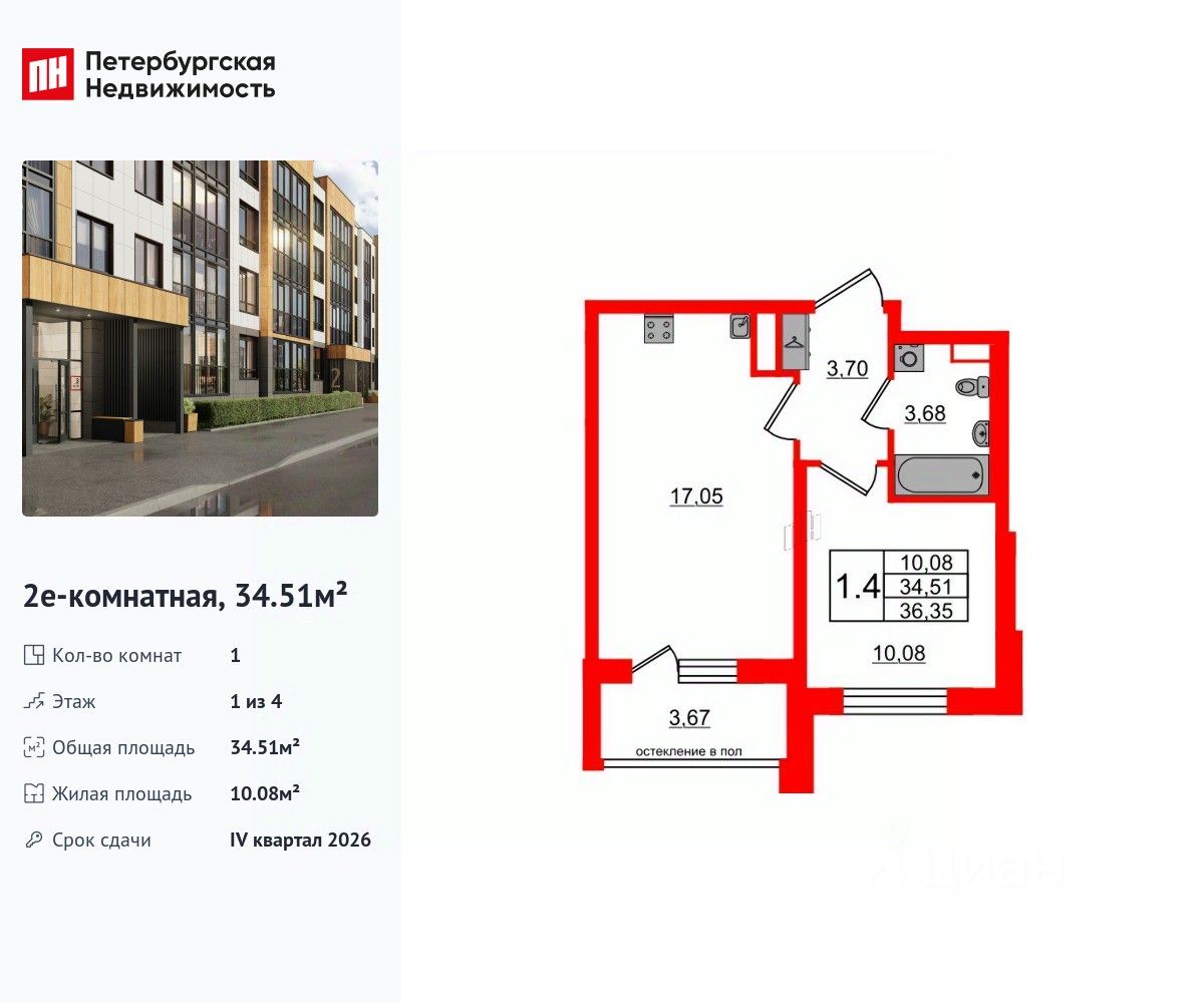 Удобная, классическая, функциональная европланировка, большая кухня-гостиная 17.05 м², вместительная прихожая 3.7 м². Общая площадь квартиры - 34.51 м², жилая 10.08 м², высота потолка 2.77 м.
