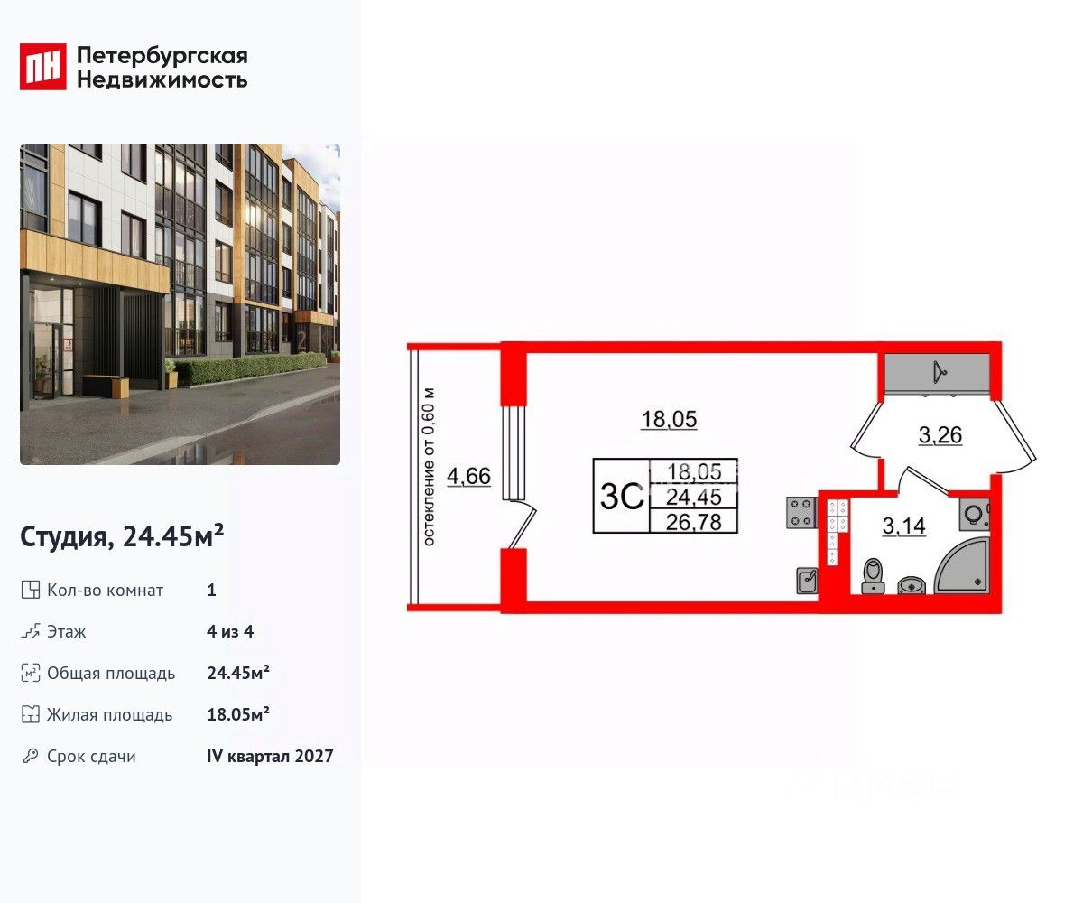 Удобная, классическая, функциональная европланировка, просторная прихожая 3.26 м². Общая площадь студии - 24.45 м², жилая 18.05 м², высота потолка 3.07 м.
