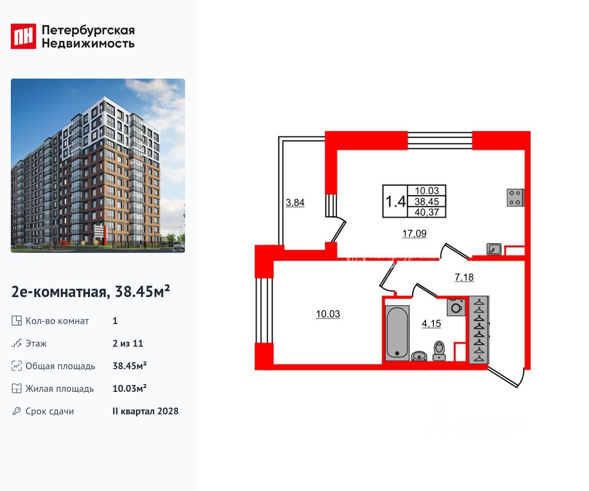 Удобная, классическая, функциональная европланировка, большая кухня-гостиная 17.09 м², просторная прихожая 7.18 м². Общая площадь квартиры - 38.45 м², жилая 10.03 м², высота потолка 2.77 м.