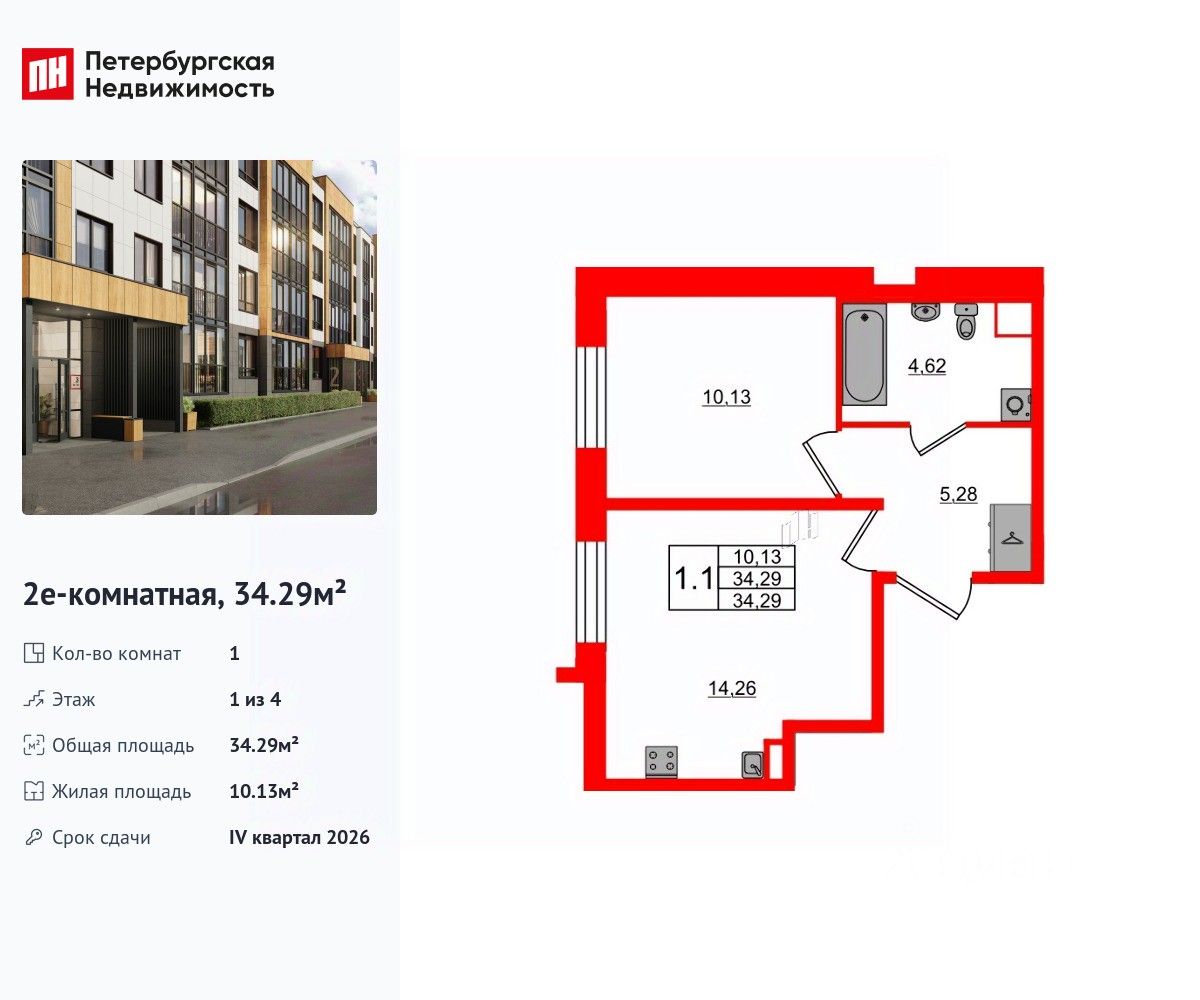 Общая площадь34,29 м2