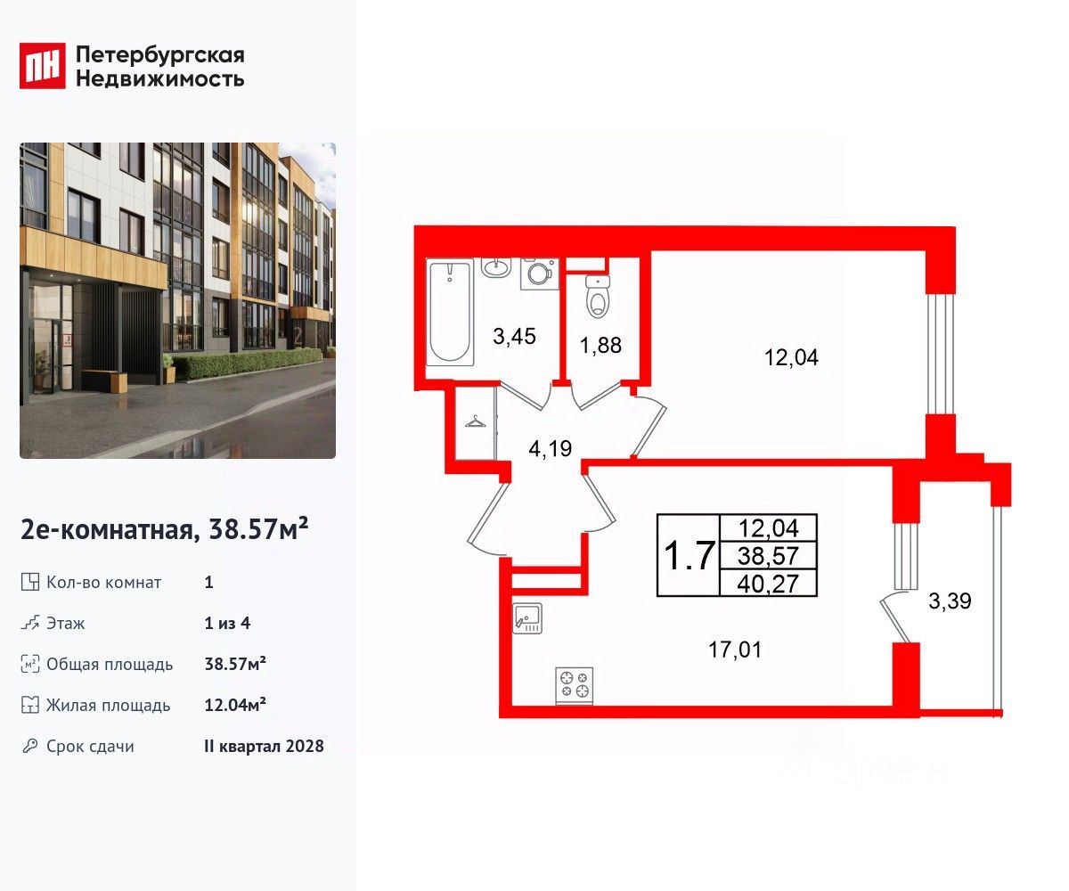 Удобная, классическая, функциональная европланировка, большая кухня-гостиная 17.01 м², просторная прихожая 4.19 м². Общая площадь квартиры - 38.57 м², жилая 12.04 м², высота потолка 2.77 м.
