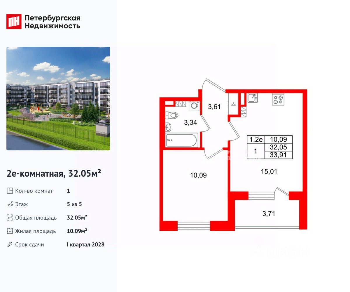 Удобная, классическая, функциональная европланировка, большая кухня-гостиная 15.01 м², вместительная прихожая 3.61 м². Общая площадь квартиры - 32.05 м², жилая 10.09 м², высота потолка 3.07 м.