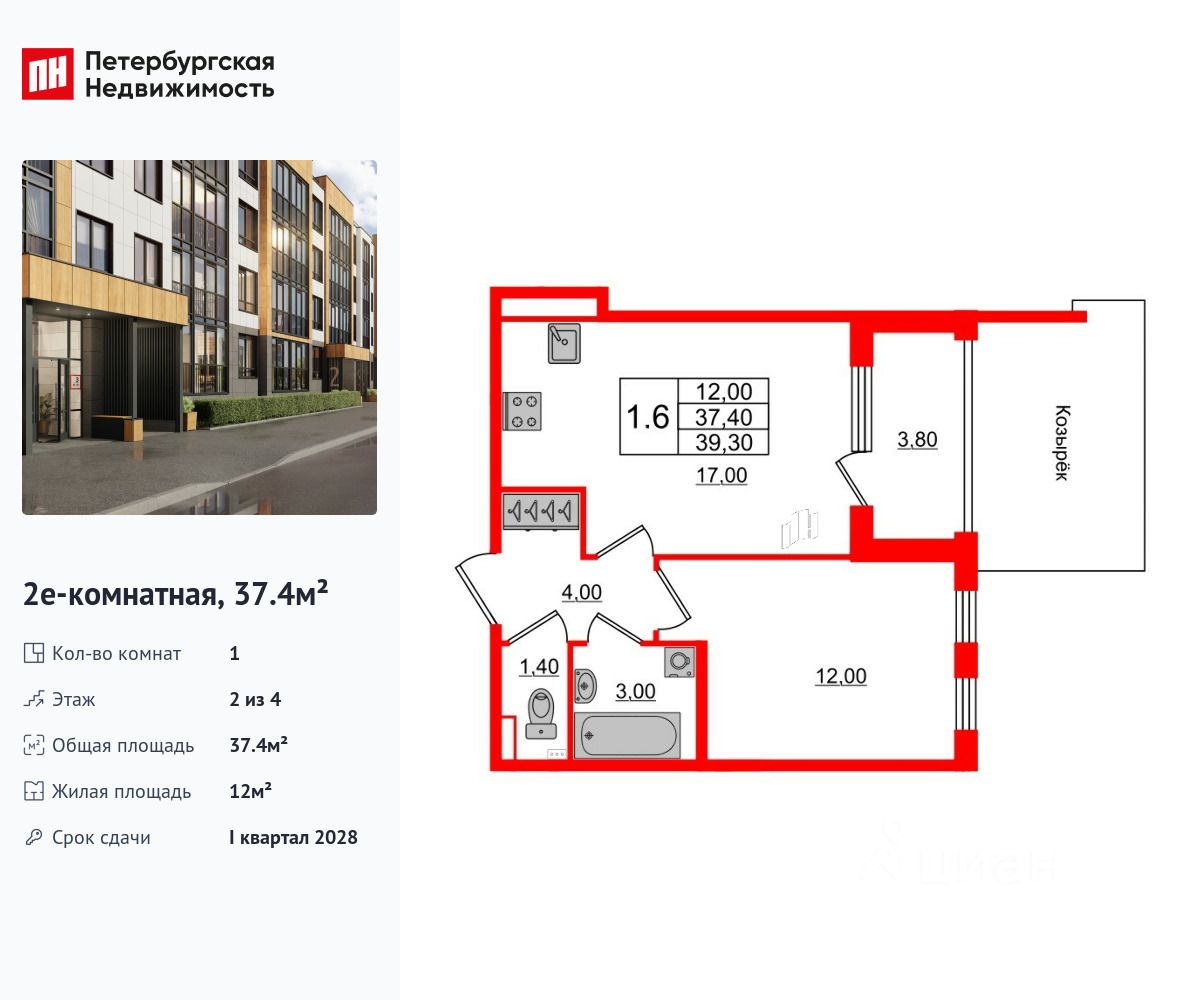 Удобная, классическая, функциональная европланировка, большая кухня-гостиная 17 м², вместительная прихожая 4 м². Общая площадь квартиры - 37.4 м², жилая 12 м², высота потолка 2.78 м.
