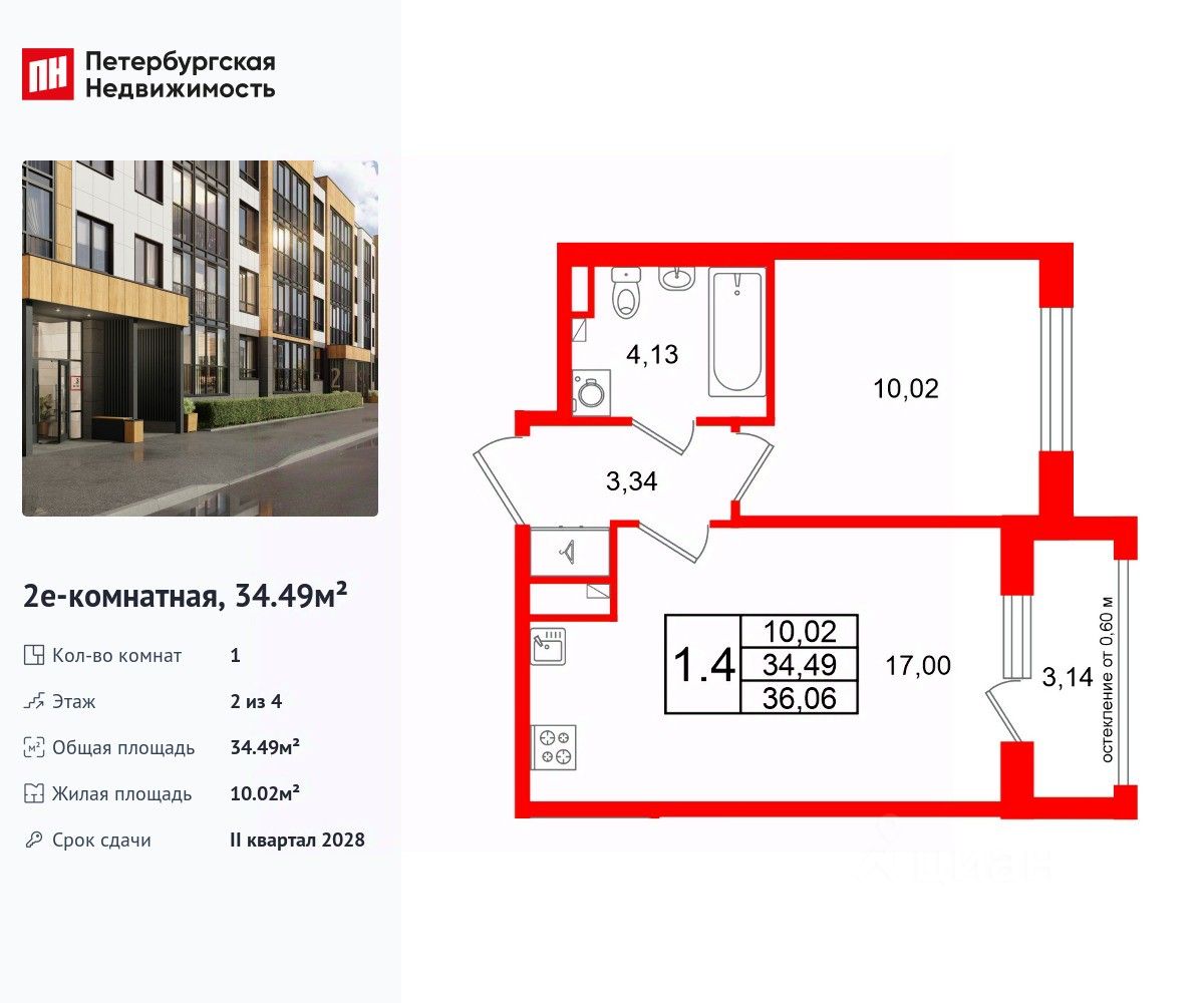 Удобная, классическая, функциональная европланировка, большая кухня-гостиная 17 м², вместительная прихожая 3.34 м². Общая площадь квартиры - 34.49 м², жилая 10.02 м², высота потолка 2.77 м.
