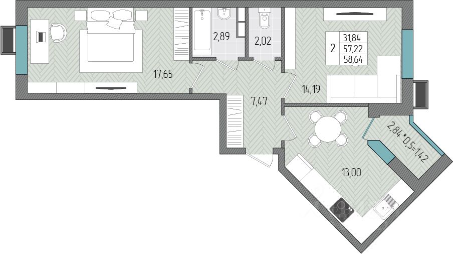 Общая площадь58,64 м2
